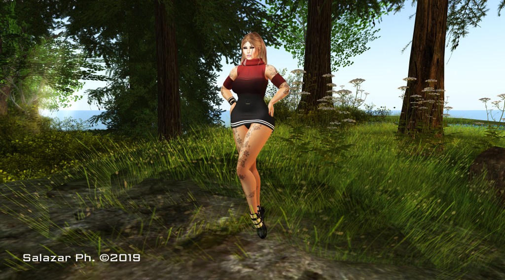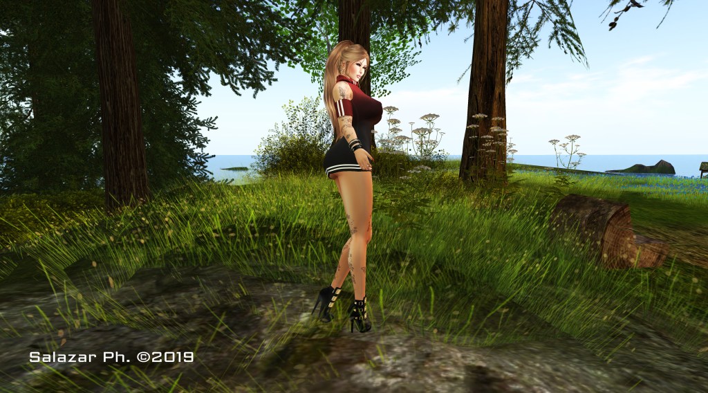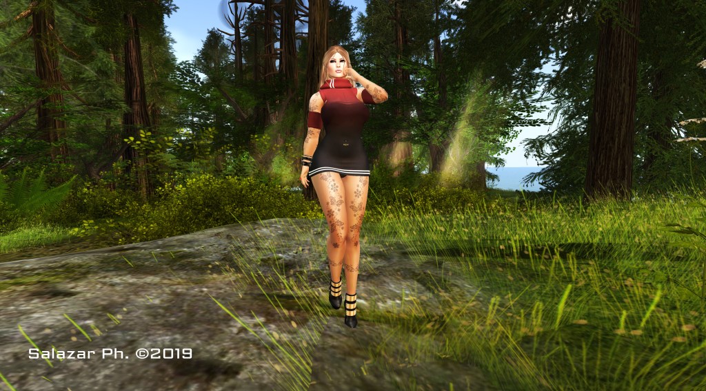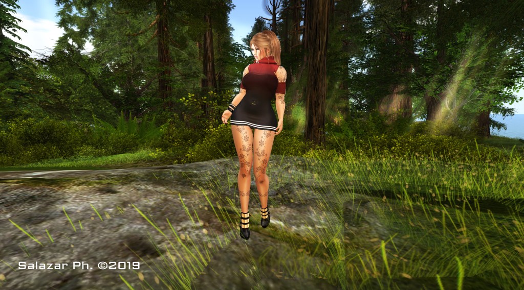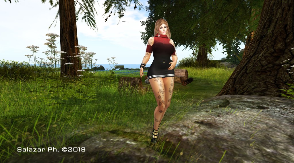 DeeDee is wearing ADN Alana dress with multiple texture hud (you can select flat color or shades) and has matched it with Melya Boots from Hilly Haalan (previous Group gift).